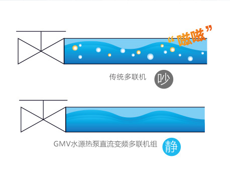 傳統機組在冷媒流量調節時會發出類似“茲茲”的液流噪音,GMV水源熱泵直流變頻