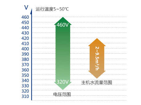 水側換熱器進水范圍:5~50℃,主機水流量范圍:2~9.5m3/h,滿足全國大部分地區的地理環境使用要求;